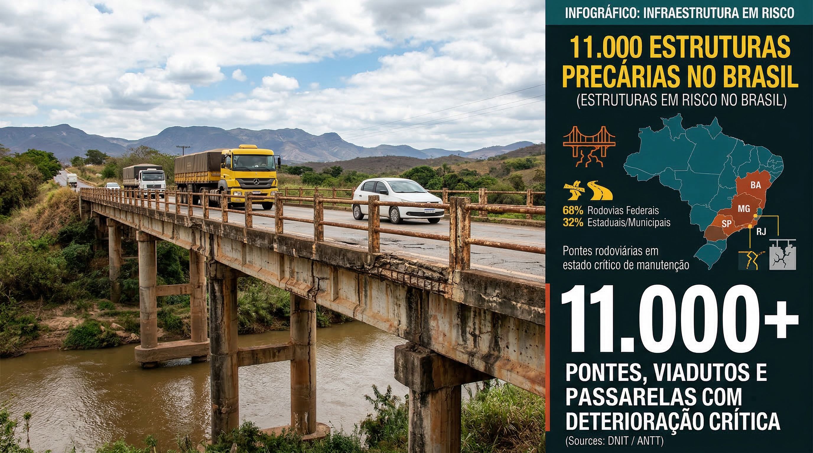Pontes e viadutos no Brasil: 11 mil estruturas precárias e demanda de R$ 38 bi/ano: O Brasil tem mais de 113 mil pontes e viadutos, das quais 11 mil estão em condições precárias. Apenas 12.142 (<11%) tem monitoramento adequado, e 42 mil excedem 50 anos de vida útil projetada. Investimento necessário: R$ 38 bi/ano para manutenção e recuperação. Norma NBR 9452/2023 exige inspeções a cada 2 anos e manutenção a cada 5. Concessionárias privadas tem desempenho superior em manutenção. Caso emblemático: colapso da ponte JK sobre o Rio Tocantins (dez/2024).